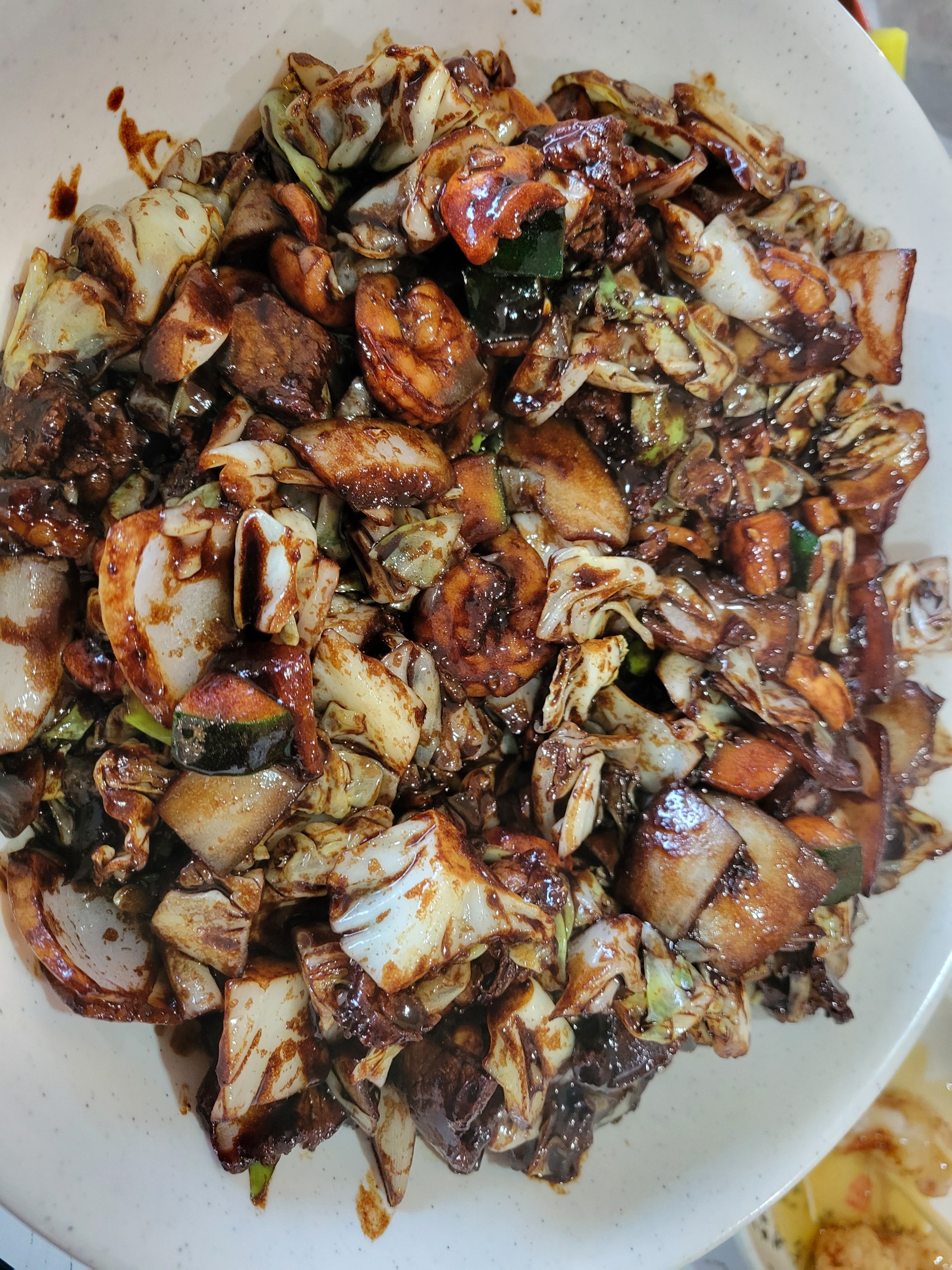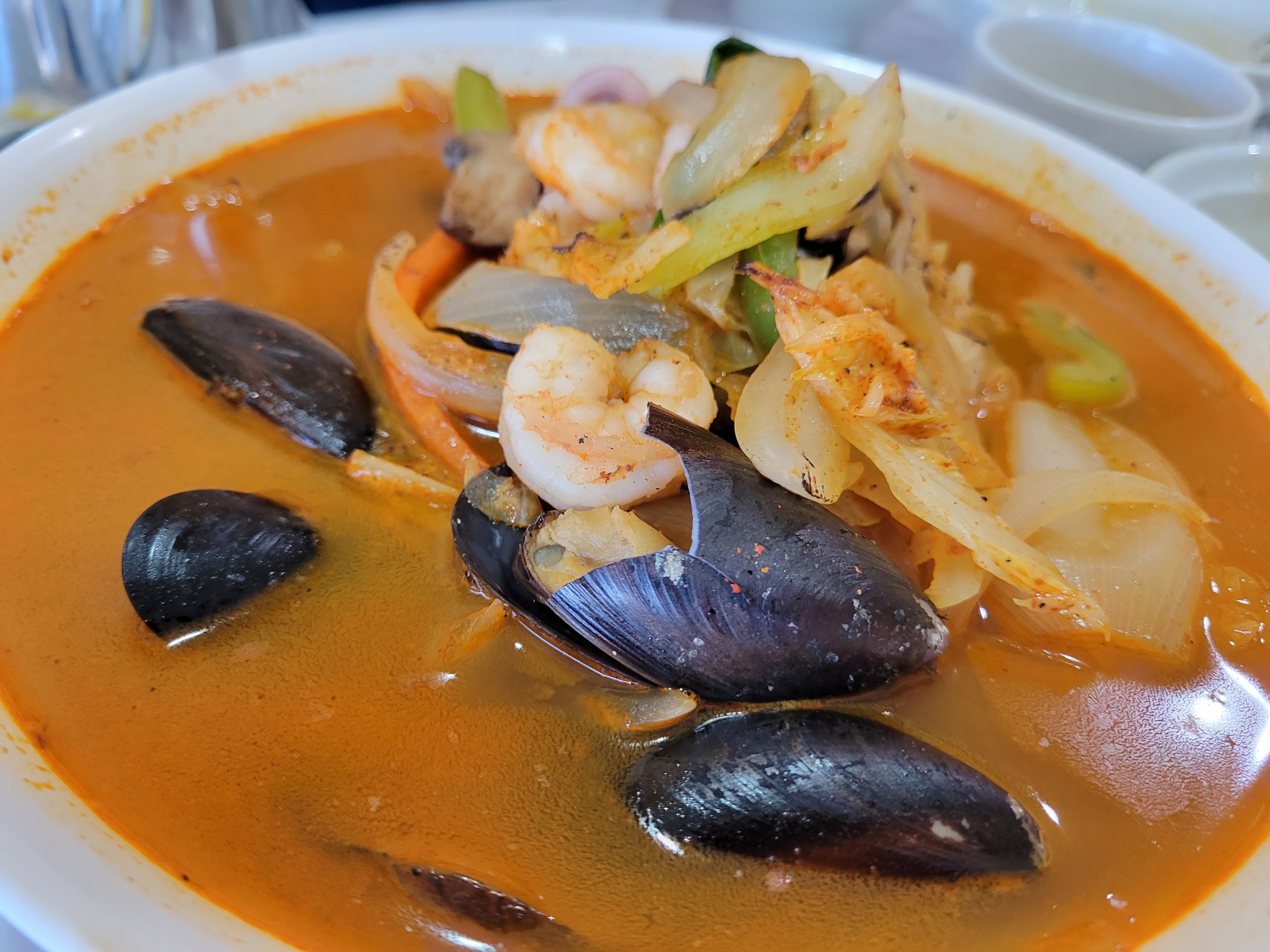 양파, 호박, 양배추, 새우, 오징어, 고기등 건더기 많아요.