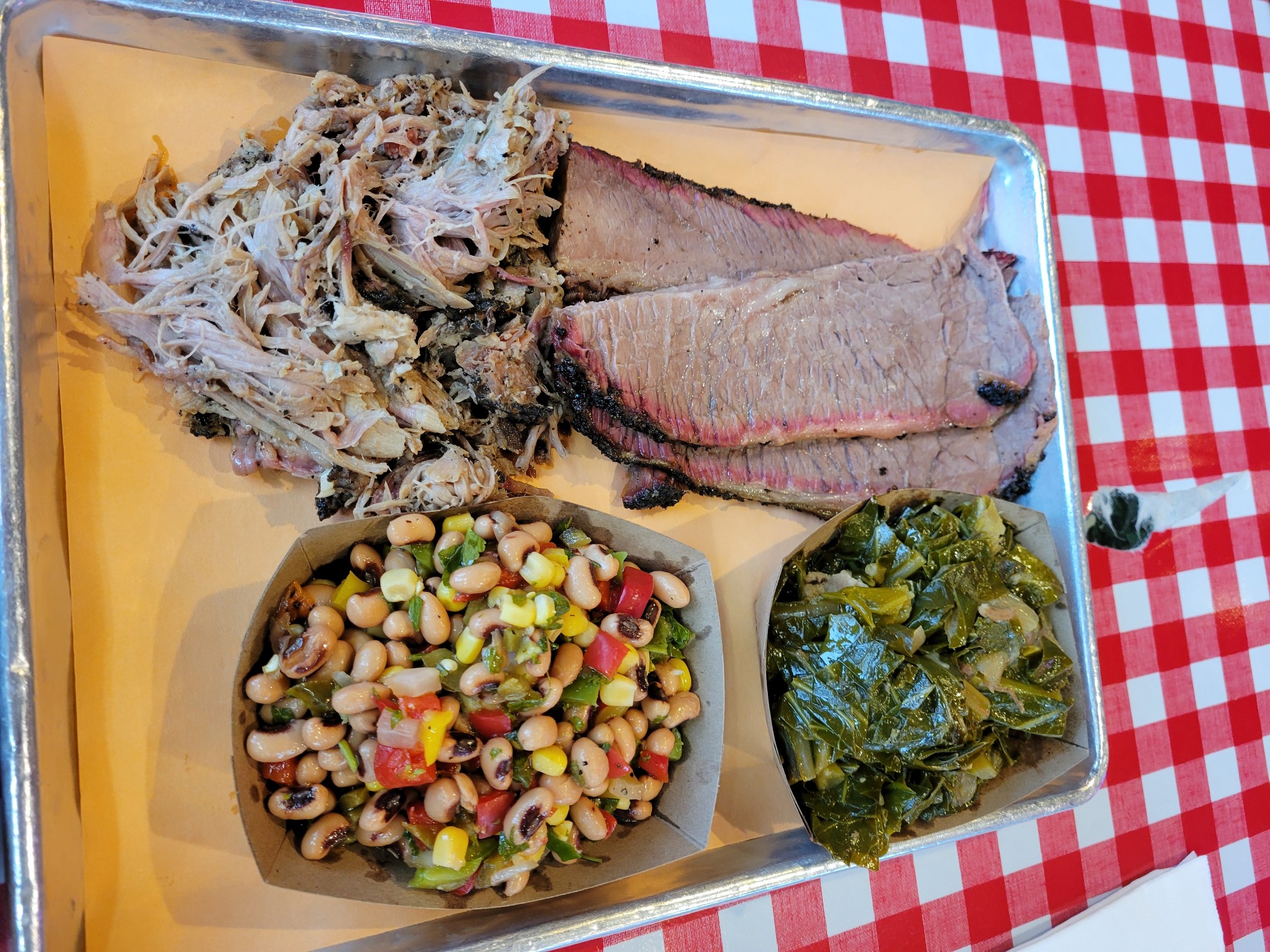 풀드포크와 브리스킷, 칼라드그린, 블랙아이드 콩(텍사스캐비어)